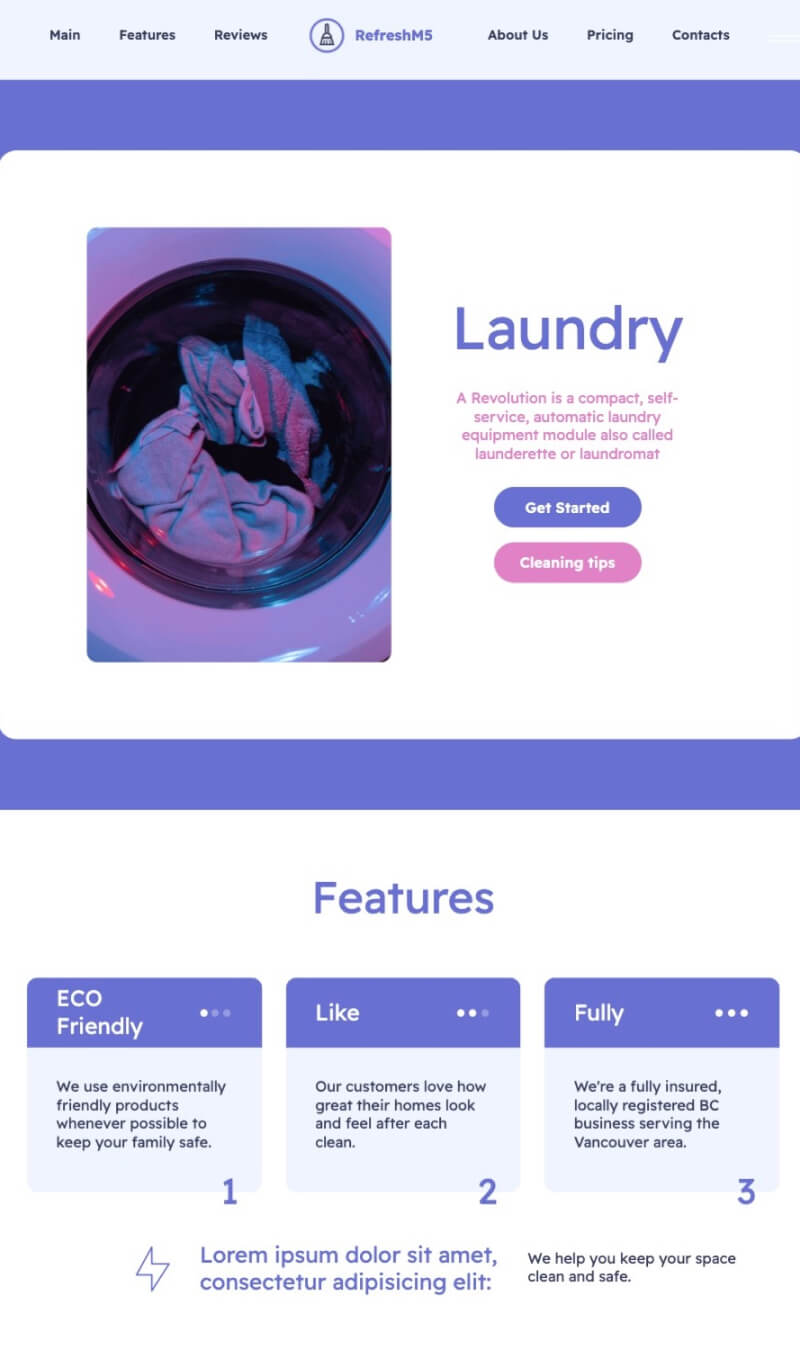 RefreshM5 comes with a set of Bootstrap 5 blocks for cleaning service companies, dishwasher, car washing, disinfectant, Cleaning supply, washing services, heavy equipments, Pest Control Equipment, Cleaners Business, sanitizing, laundryman, dry cleaning, clothes cleaning, house help, window Cleaning, dry cleaning shops, corporate cleaning solutions, maid service companies, free clean, pool services and general service company. It will undoubtedly capture your clients' eye due to the round corners and vibrant colors.